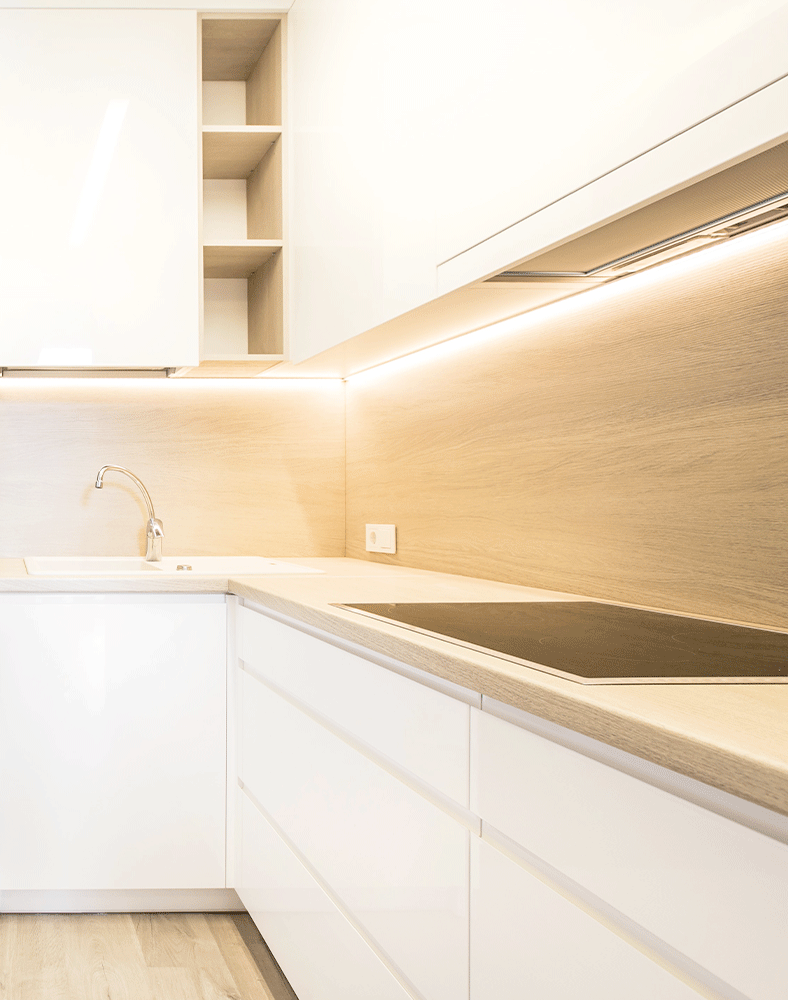 La rénovation de la cuisine en L a été conçue avec des rangements hauts et bas sur mesure. Pour la chambre, des travaux de démolition d’un mur ont décloisonné et apporté de la lumière.